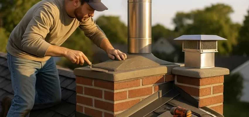 A proper crown protects the top courses. We form a reinforced, sloped crown with a drip edge and an expansion gap around the flue tile, preventing saturation and freeze damage in AMG Merrill, Duncanville.